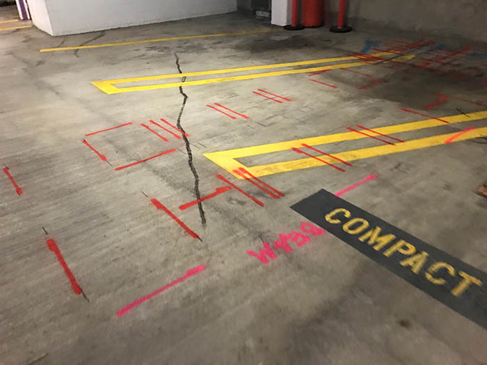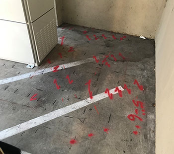 Ground Penetrating Radar Systems, Inc. - GPRS - of Southern California was contacted by an engineering firm to scan for post tension cables on the third level of a parking structure. The purpose of the work was to repair post tension cables throughout all the levels of the structure due to many of the cables snapping or no longer sustained the proper amount of tension; the client needed areas marked out prior to chipping through the 6” thick slab. We scanned (7) 10’x4’ areas on level E and marked all findings on the surface with spray paint. We marked all post tension cables with red paint, rebar was marked with blue paint and beams were marked with pink paint.