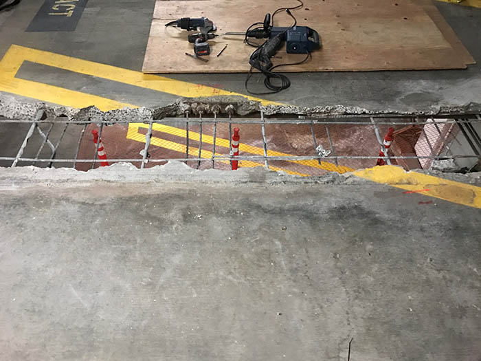 Photo of pour strip. This image shows some of the damaged post tension cables that were exposed.