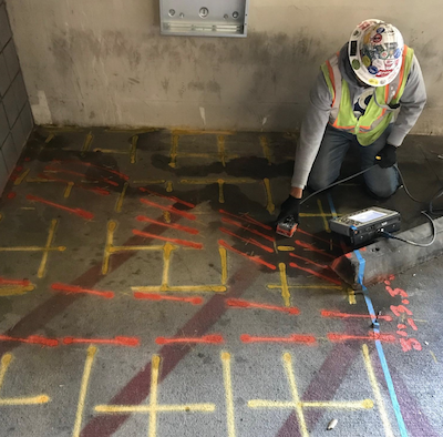 Ground Penetrating Radar Systems, Inc. - GPRS - of Southern California was contacted by an electrical company in order to scan for reinforcing or conduits prior to anchoring. We were asked to scan (6) 7’x5’ areas prior to drilling up to 4” deep for new bollards that would be guarding the new electrical charging stations that were put in place. We found that the slab was approximately 8” thick and consisted of rebar at 16” on center; we found up to 6 conduits in one location up to 3”-3.5” deep. We marked all findings with chalk paint, we used yellow for rebar and orange for conduits. We also used Radio Detection to check for any potential live conduits in the areas. Due to the conduit findings in one of the locations, the customer had to make a minor adjustment to drill just outside the findings.